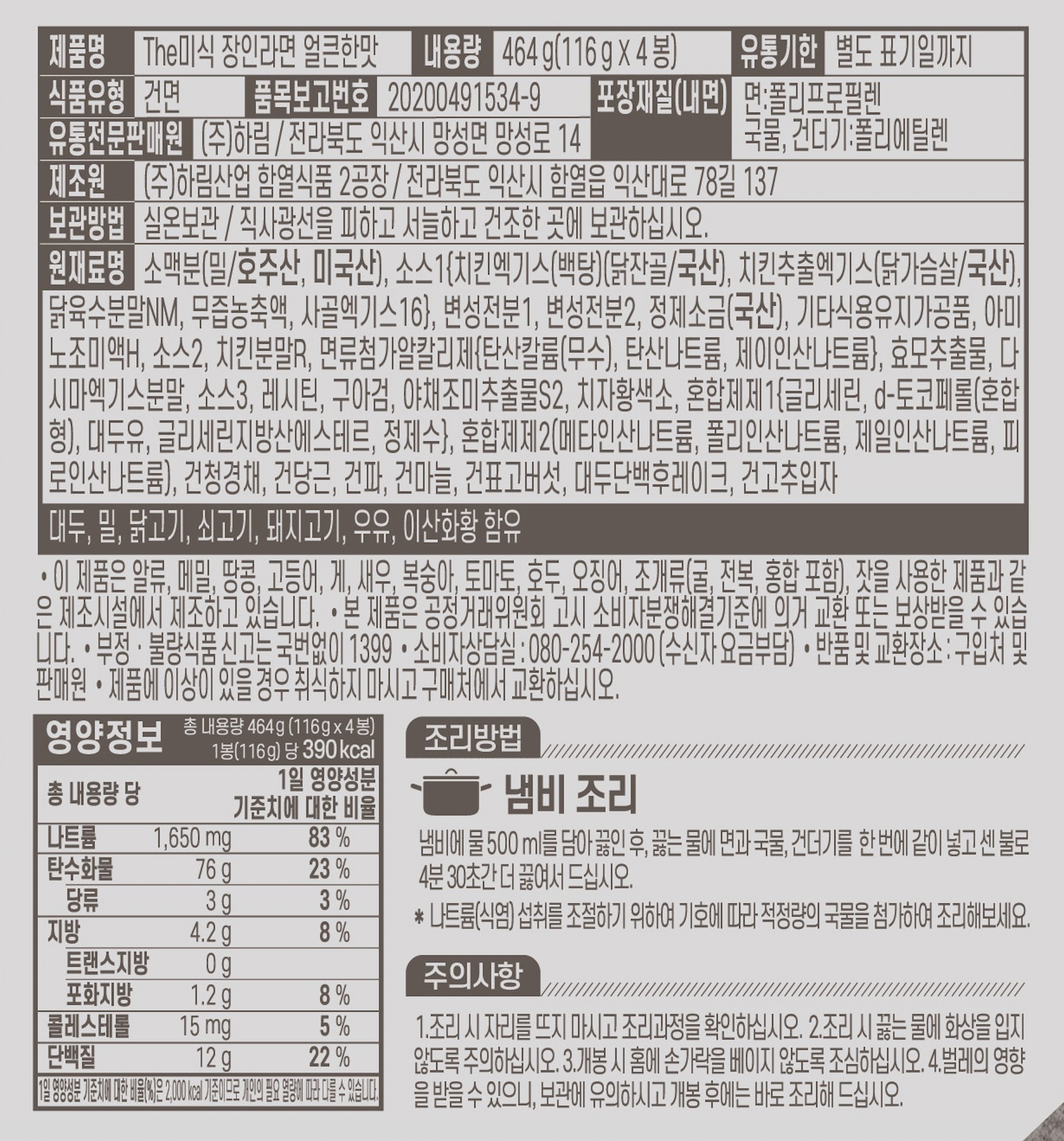 THE미식 장인라면 얼큰한맛 봉지라면 116g X 4봉