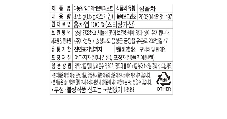 (기한임박 70%할인) 다농원 잉글리쉬브렉퍼스트 삼각티백 25개입