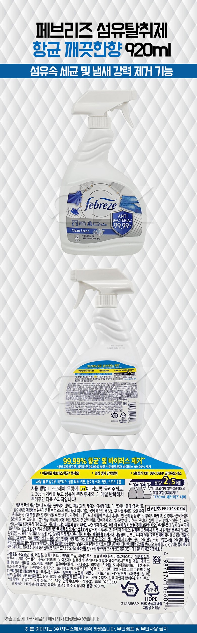 ◆페브리즈 섬유탈취제 향균 ANTI BACTERIAL 99.99% 920ml