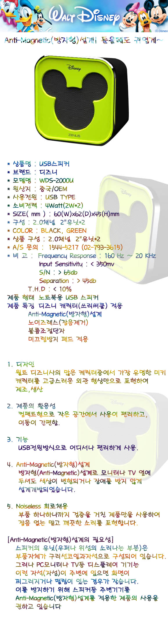 월트 디즈니 미키 캐릭터 USB 미니 스피커 WDS-2000U (그린)