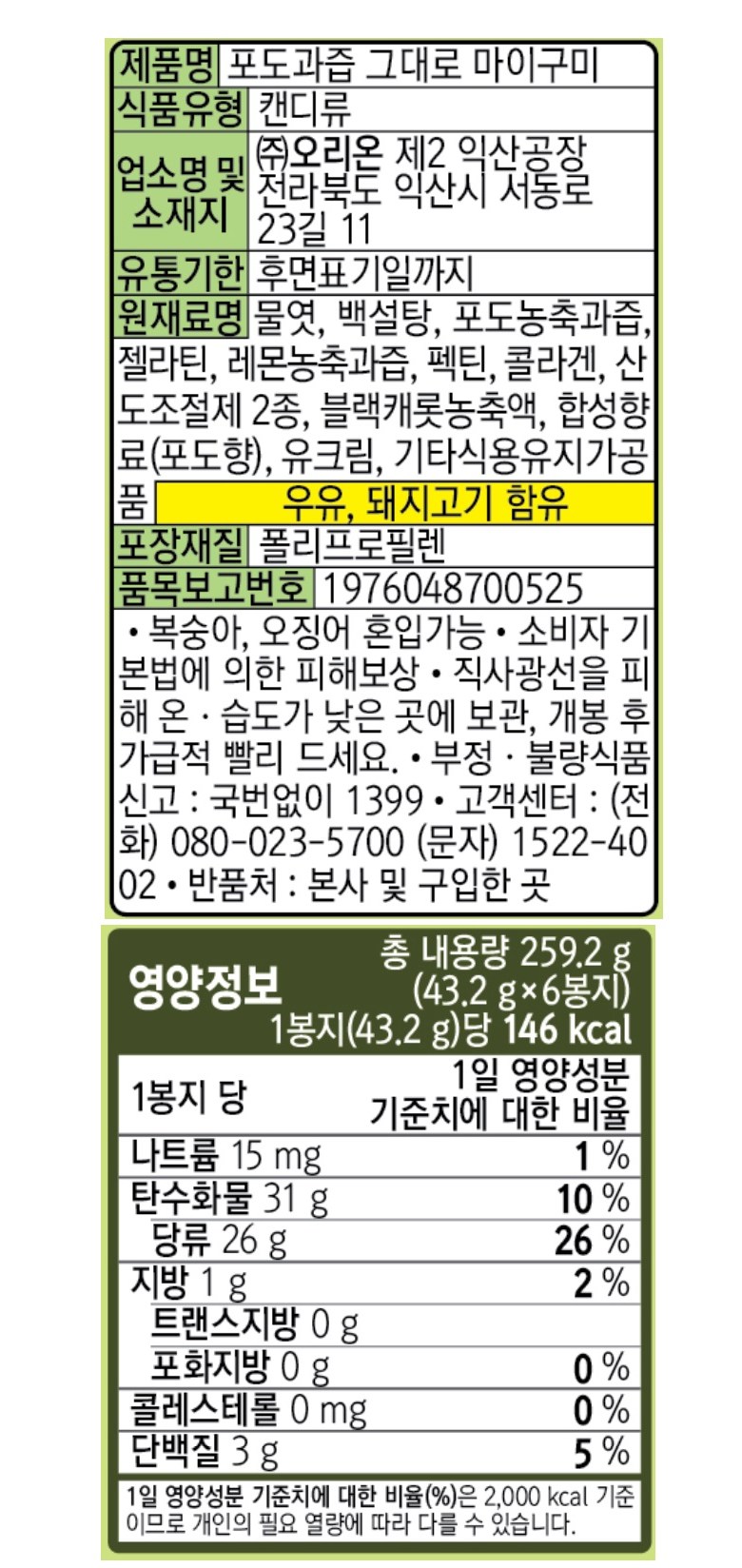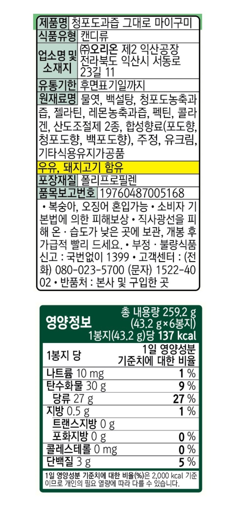 오리온 청포도과즙 그대로 마이구미 젤리 259.2g