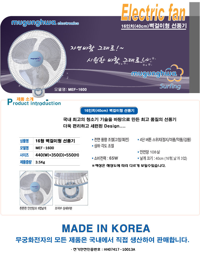 [국산]무궁화전자 16" 40cm 벽걸이형 名品 선풍기[MEF-1600]