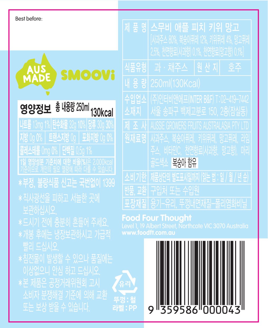 (단종)스무비 GREEN 그린 프리미엄 과일주스(No.3) 250ml x 12병