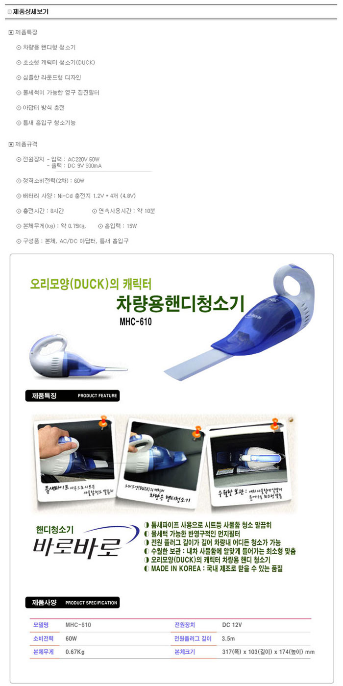 [국산]무궁화 바로바로 차량용 핸디 청소기[MHC-610]