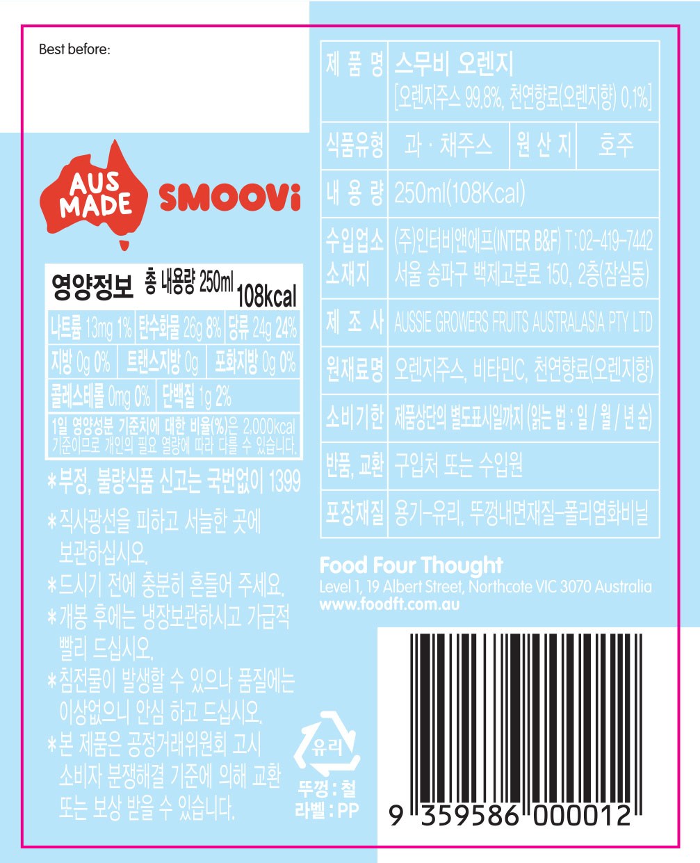 스무비 오렌지 프리미엄 과일주스(No.1) 250ml x 3병(낱개)