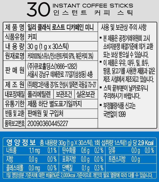 일리 클래식 로스트 디카페인 미니 커피스틱 30T