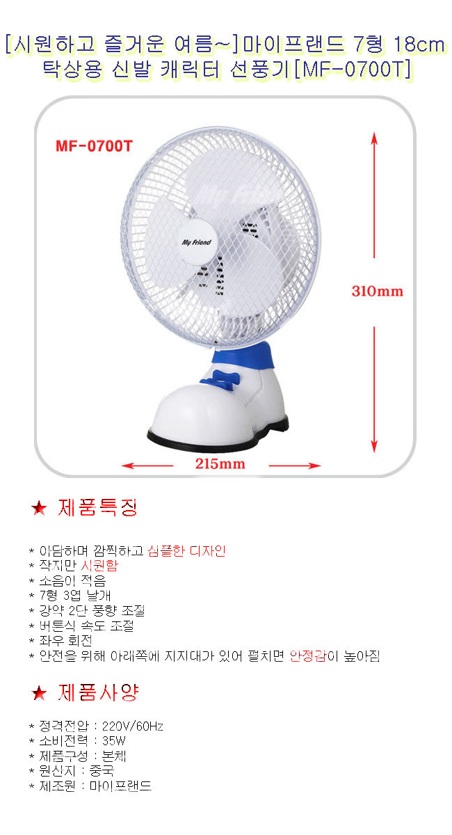 마이프랜드(my friend) 7형 18cm 탁상용 신발 캐릭터 선풍기[MF-0700T]