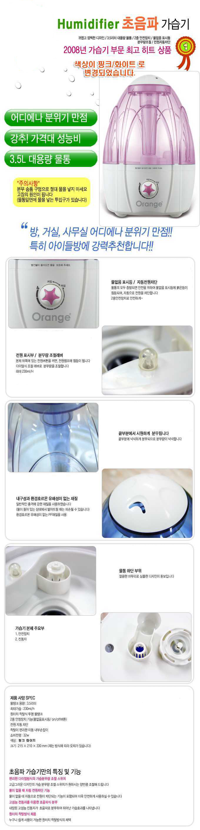 ★필터없이 공기를 자연가습 깨끗하게~★분무구 360도회전/물보충알림램프/분무량조절 Orange 생활 Upgrade 초음파식 가습기(3.5L)[VSH-VH3000]