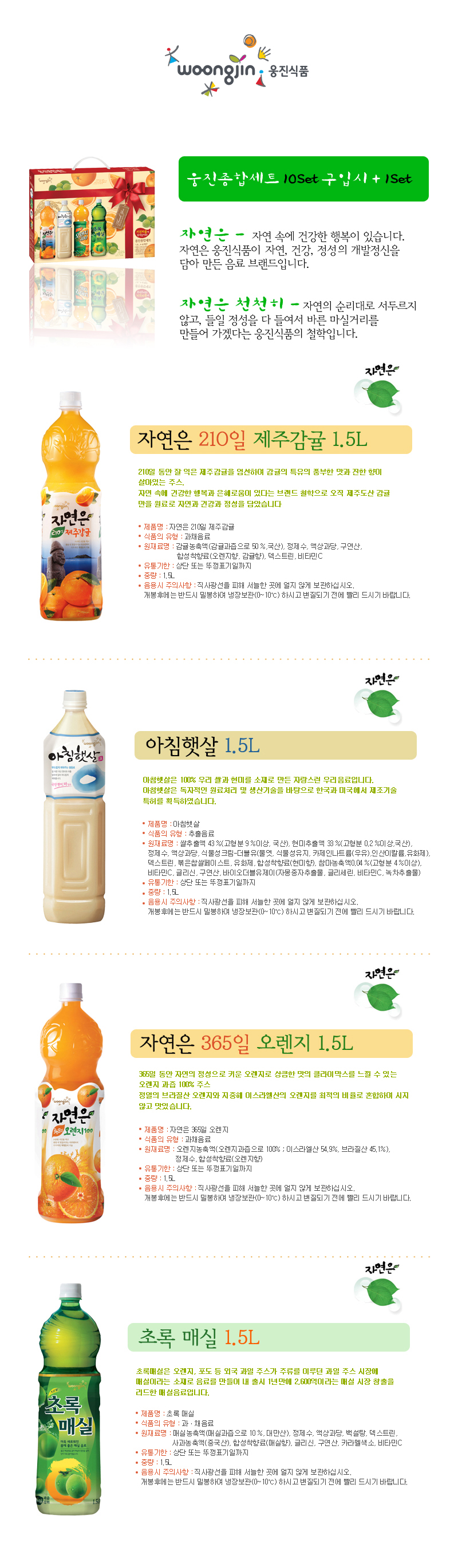 자연은 웅진종합선물세트1.5Lx4개(아침햇살+초록매실+오렌지+제주감귤)+키친타올증정 10+1