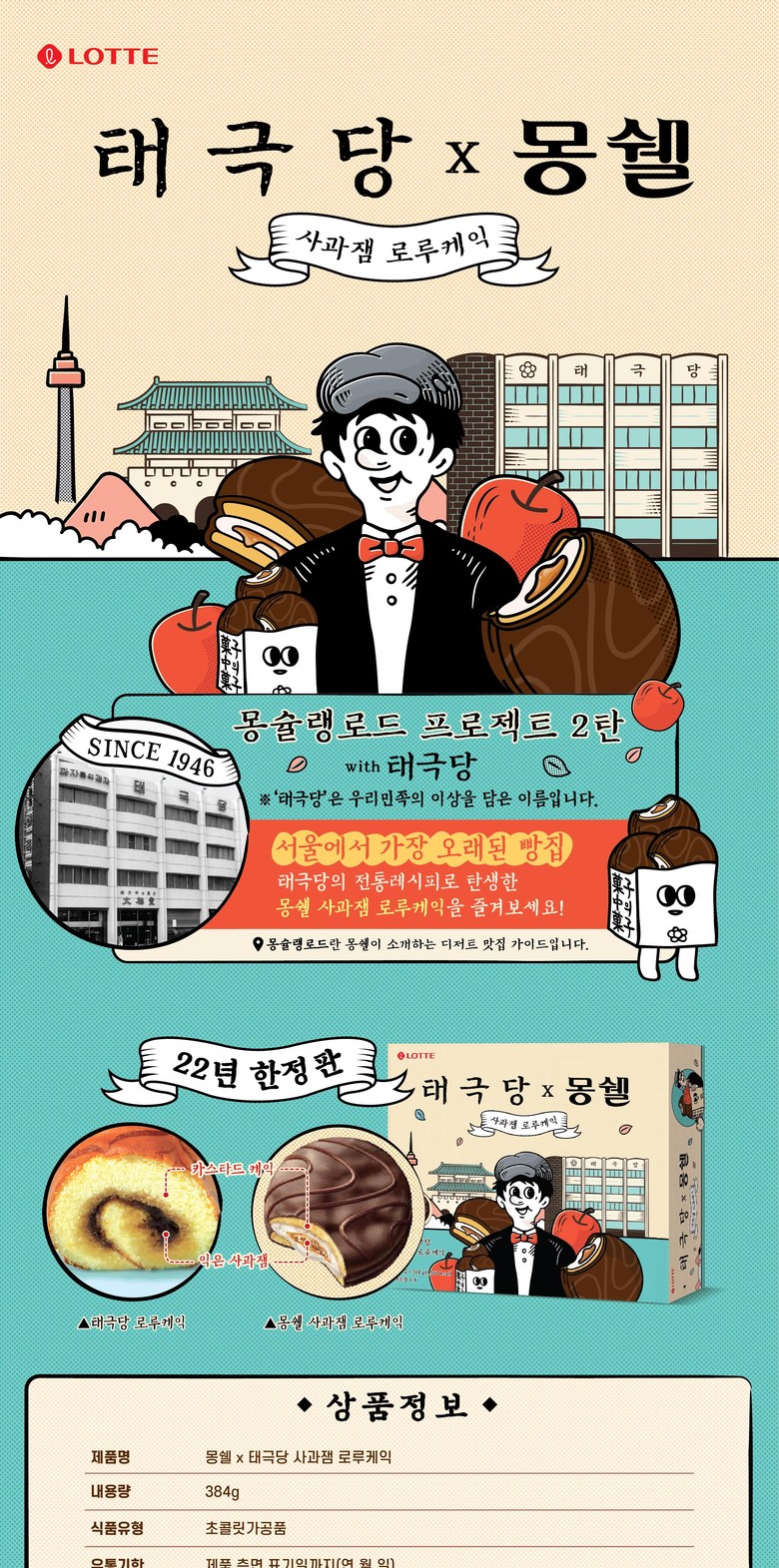 6000 롯데 몽쉘 X 태극당 사과잼 로루케익 384g 2번들