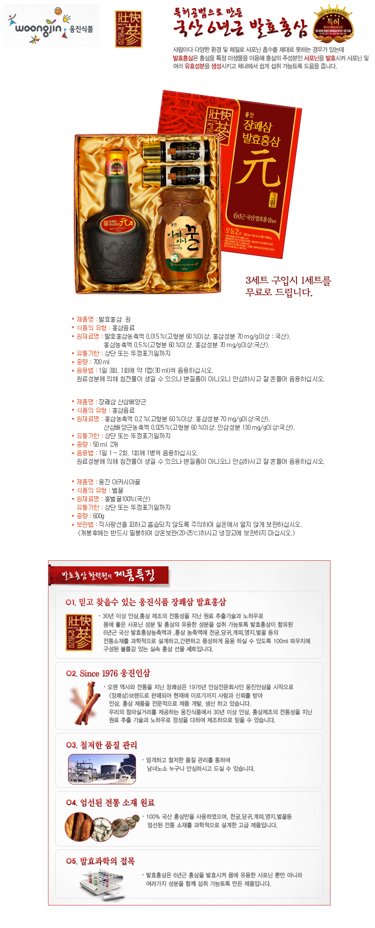장쾌삼 발효홍삼 원모둠2호(700ml)+산삼(50mlx2입)+벌꿀(600g) 3+1(3세트 구입시 1세트를 무료로드립니다.)