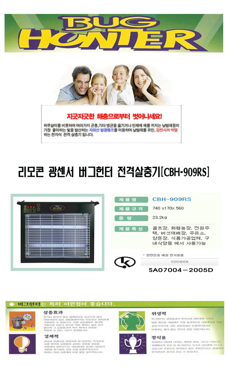 [대형식당/공장/농장 등! OK!]대용량! 리모콘 광센서 버그헌터 전격살충기[CBH-909RS]
