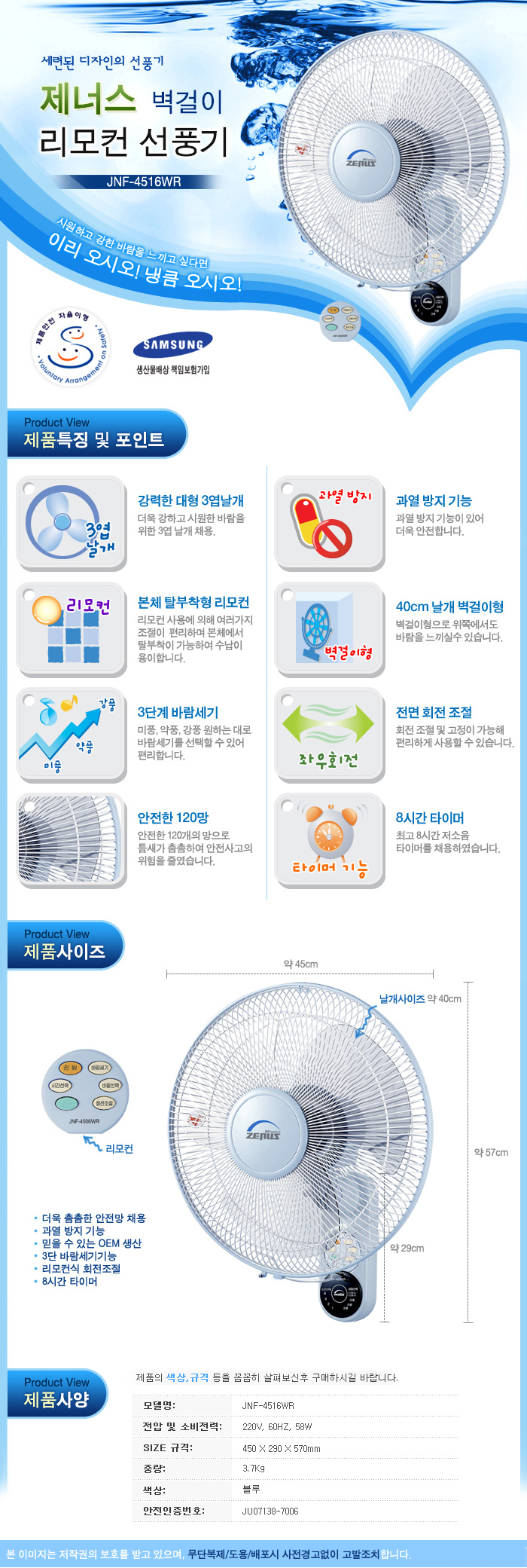 제너스 16형 40cm 좌우회전 각도조절 벽걸이 리모콘 선풍기[JNF-4516WR]