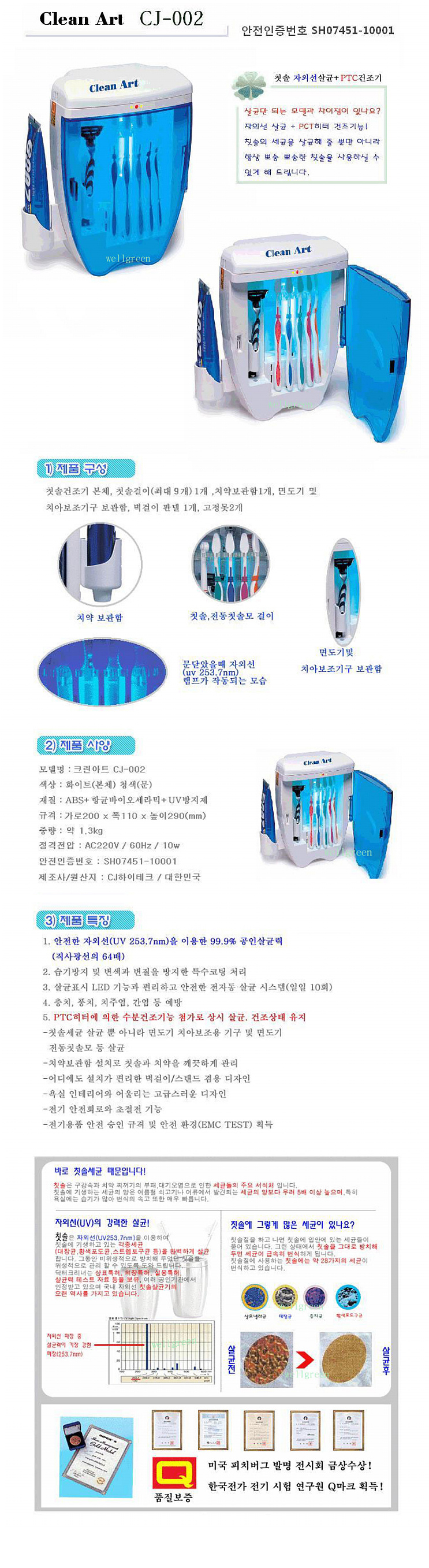 [미국 피츠버그 발명회 금상수상! 살균+건조가 하나로 시스템!]크린아트 칫솔살균기[CJ-002]