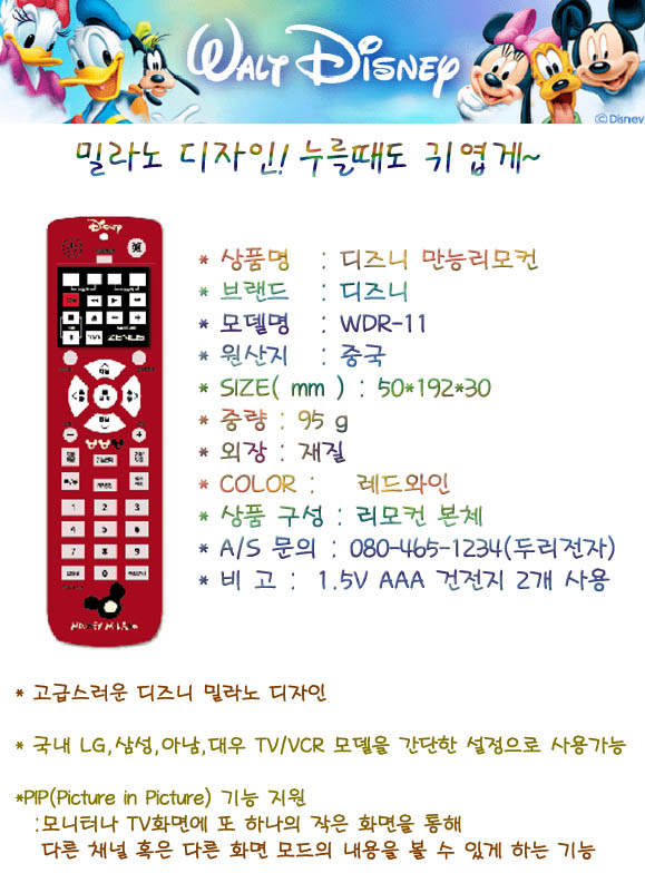 디즈니 캐릭터 레드와인 만능 통합 리모콘(LG/삼성/아남/대우)/PIP 기능 지원