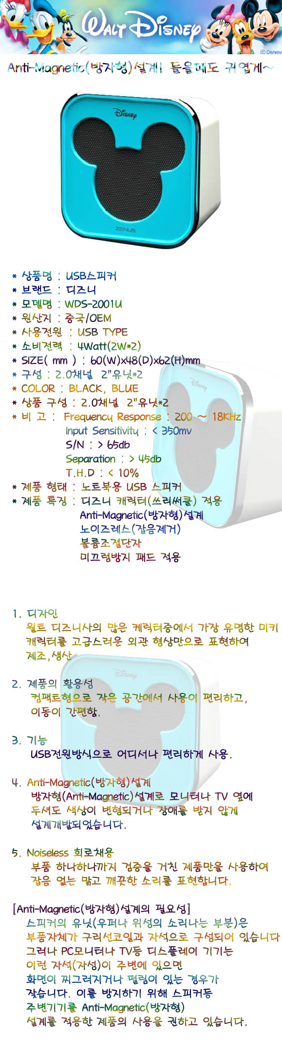 월트 디즈니 미키 캐릭터 USB 미니 스피커 WDS-2001U (블루)