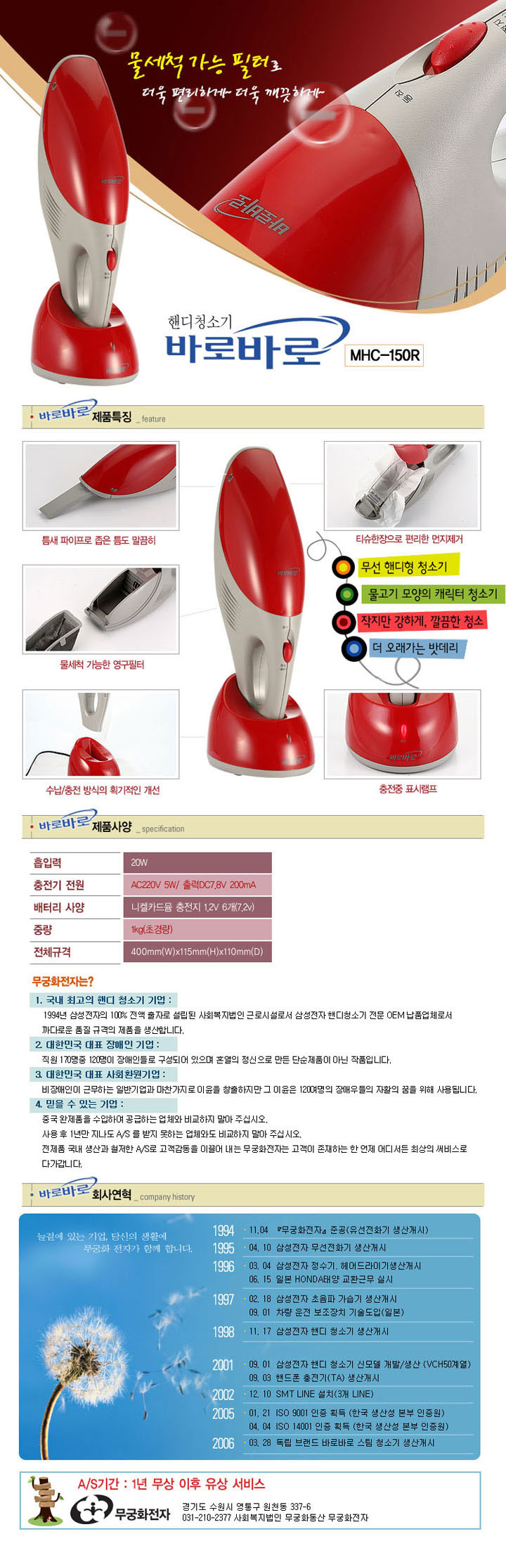 [삼성전자 oem전문납품업체]<국산>무궁화 충전식 바로바로 핸디형 청소기 MSC-150R