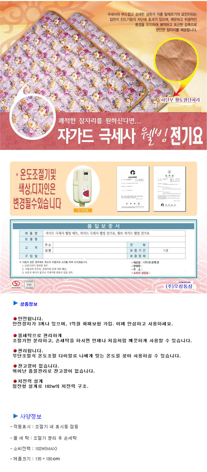 ★포근하고 따뜻한★오성 Hanaro 두툼한 프리미엄 웰빙 자가드 극세사 전기요(2~3인용)