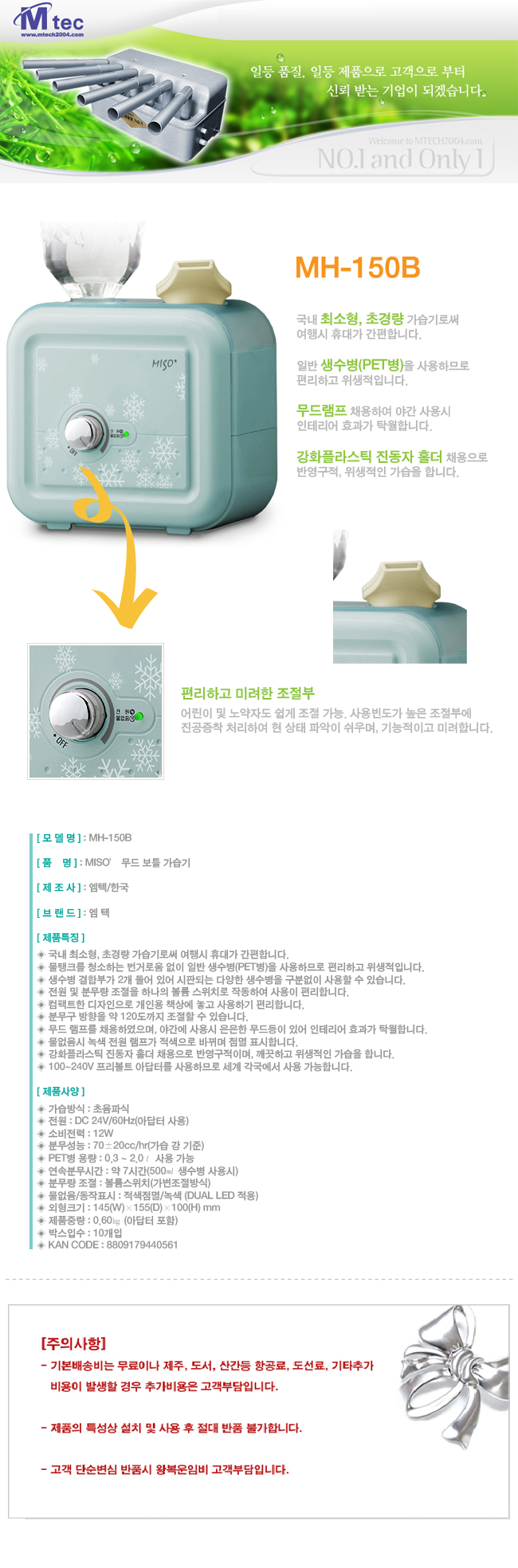 [국산! 저소음!★부식없는 진동자채용!]엠텍 무드보틀 프리미엄 가습기[MH-150B]