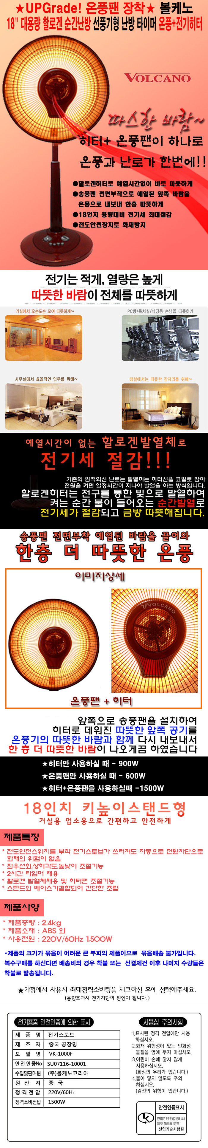 ★UPGrade! 온풍팬 장착★名品 볼케노 18" 대용량 순간난방 선풍기형 난방 타이머 온풍+전기히터[VK-1000F]
